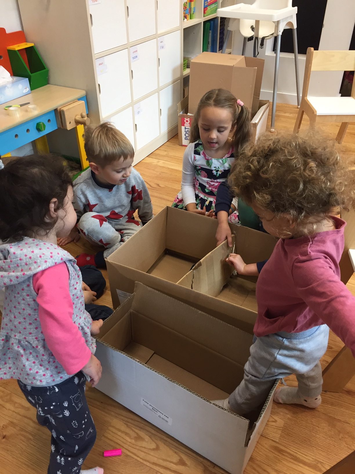 What was to be a lesson for the Frajda staff about recycling turned into a wonderful period of learning while doing. The children were so excited when Marika arrived with cardboard boxes. They could not wait to get their hands on them and soon were busy cutting, taping, and planning. When the adults stepped away, the magic began as the children talked about ways to accomplish their goals. Even the youngest wanted to be part of the action!