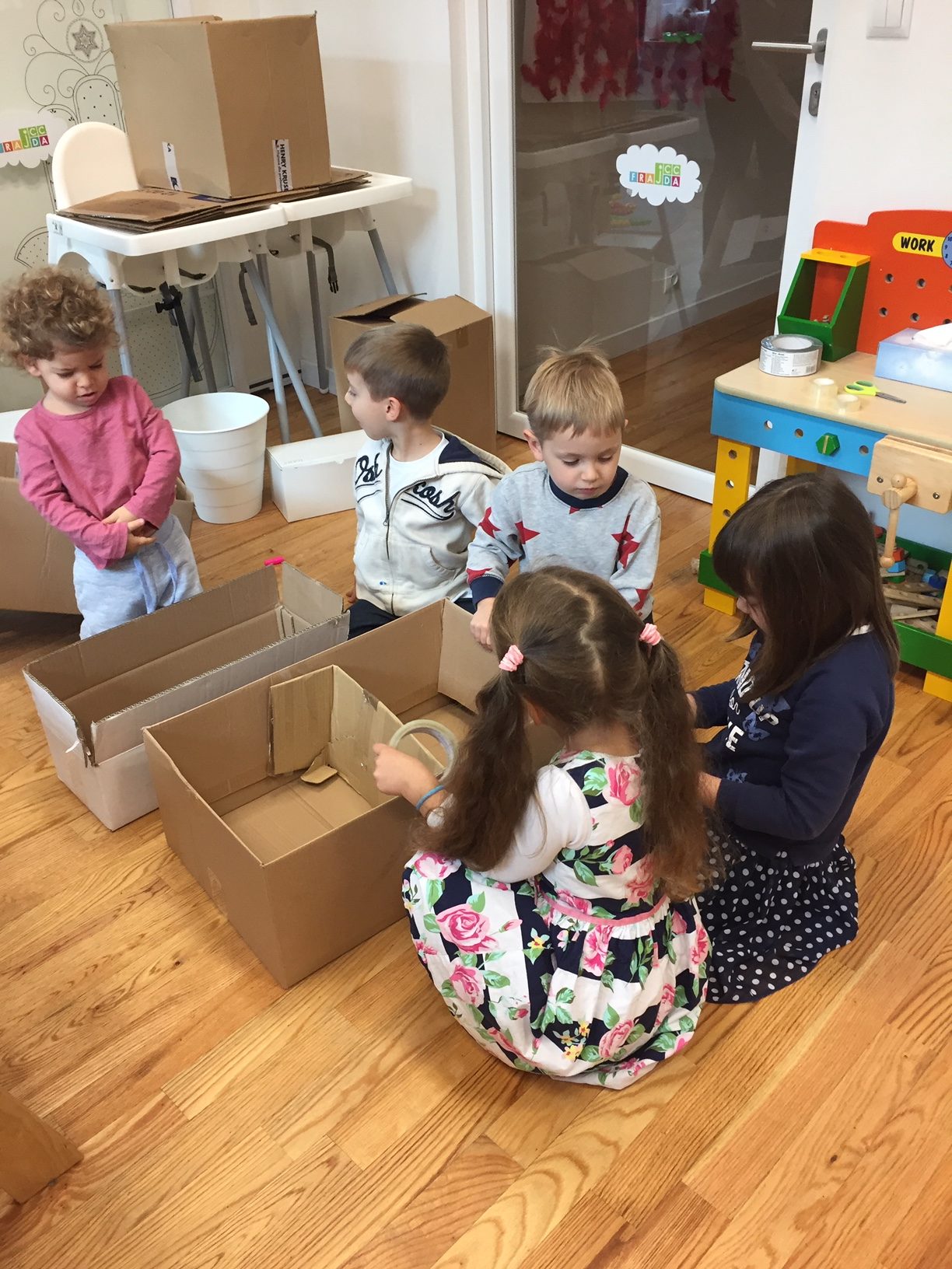 After making a box for recycling, a few boxes were put into the middle of one of the rooms. The children folded, flattened, and climbed. One box became a car for two. Another provided a hiding place for one child as the others searched for her. What an exciting time for all!