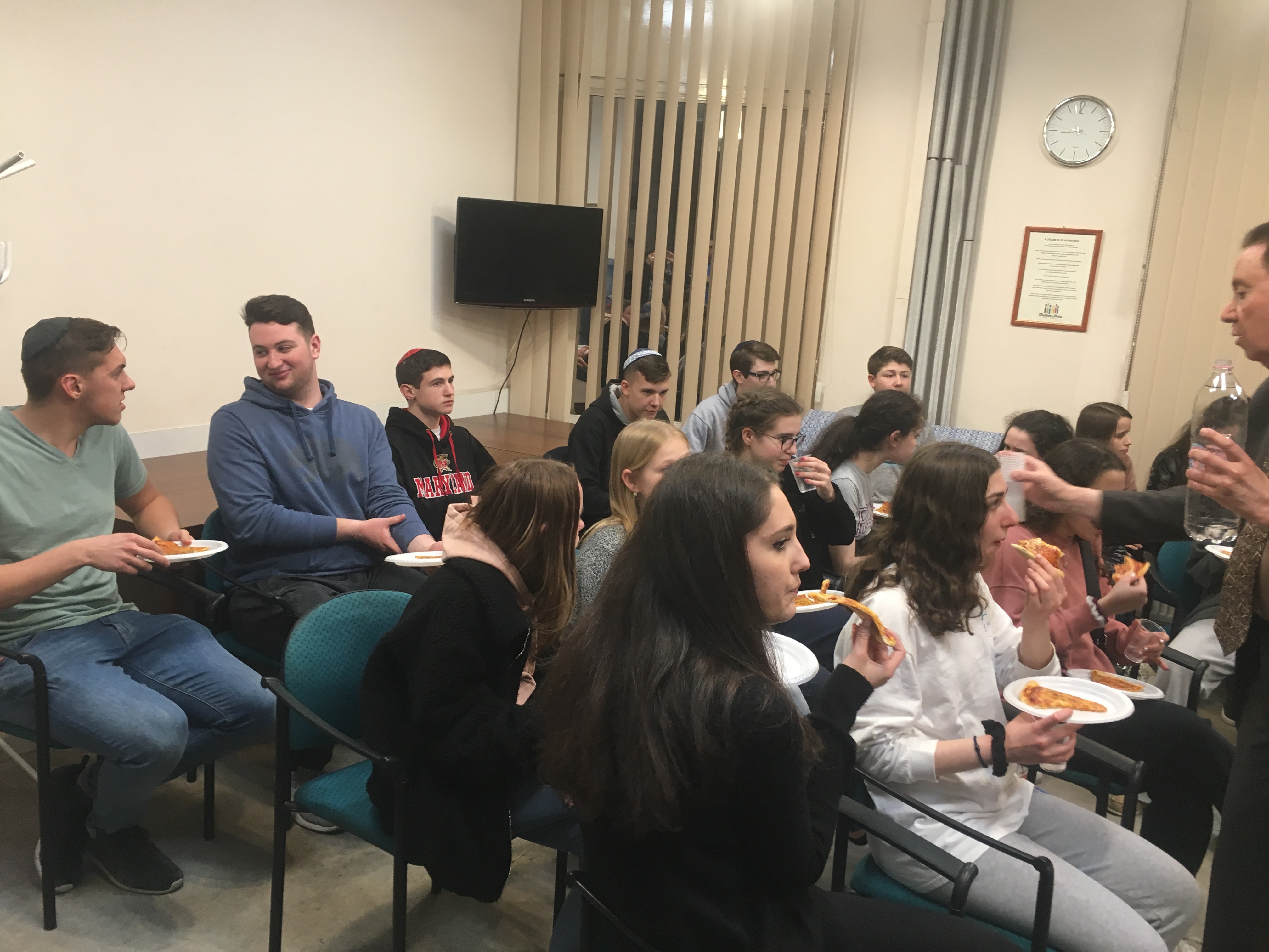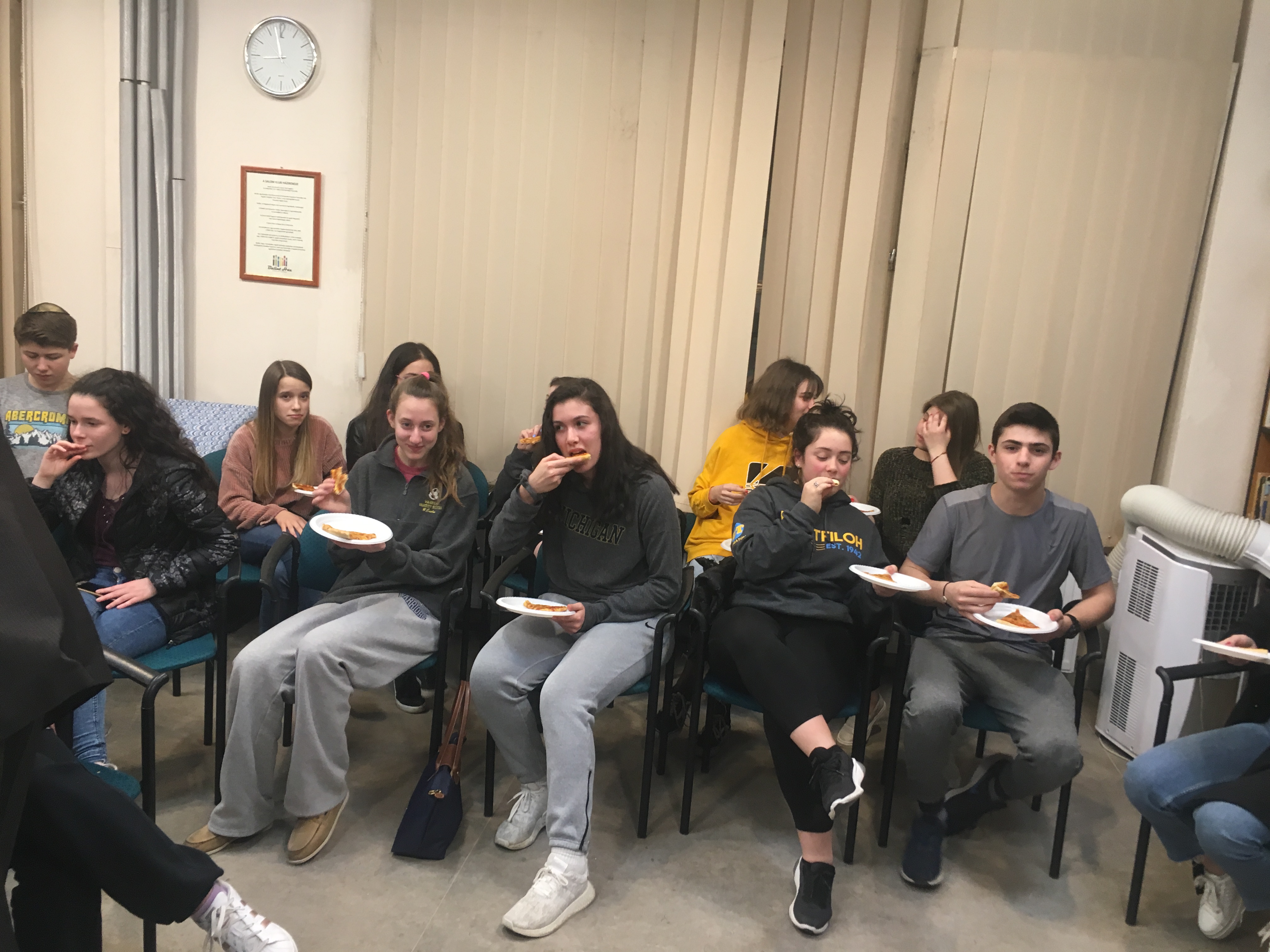 After our English class with Mrs. Steinberg, we continued our day and we couldn’t wait for the evening. We were so excited to see the students from BT. They arrived at ‘Bálint Ház’ at around 9:30pm. Since we had not been in the group in the previous year we did not know anyone. Although they were really tired we had some good conversations, which we will go on with tomorrow. We had some pizza and water and got to know each other a little. We talked about their flight, the food, and our favorite series and movies. This one hour honestly felt like 5 minutes. Zsolt told us the program for tomorrow, which we are really looking forward to. Rabbi Soskil from BT greeted us and said a prayer. Then we said goodbye to our new friends. We are really looking forward to the following days’ programs together.