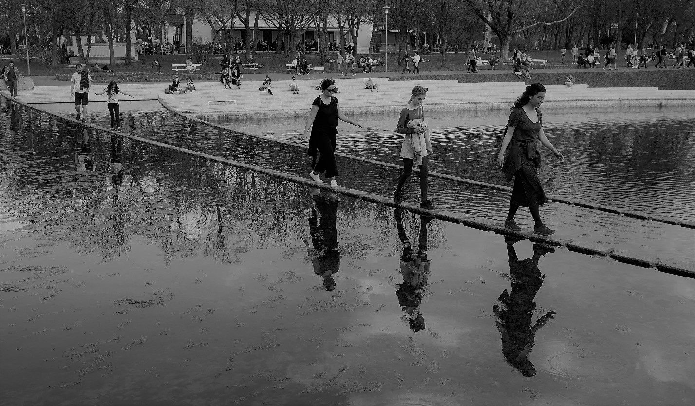 Locals Cross a Narrow Path Across Water at the Millenniumi Emlékmú